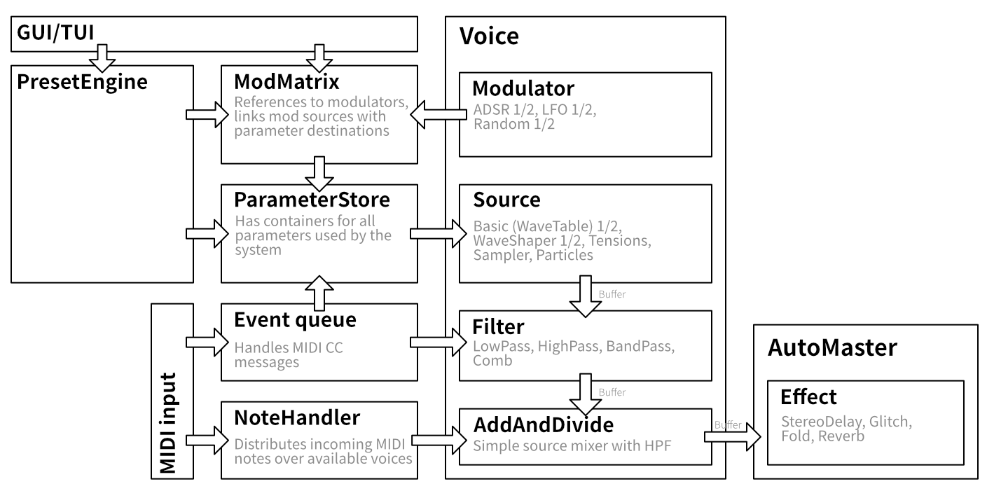 All these systems and modules are interconnected through a few key services components: Presets, Parameters, Modulation Matrix, and Control Map. The current system design looks something like this: